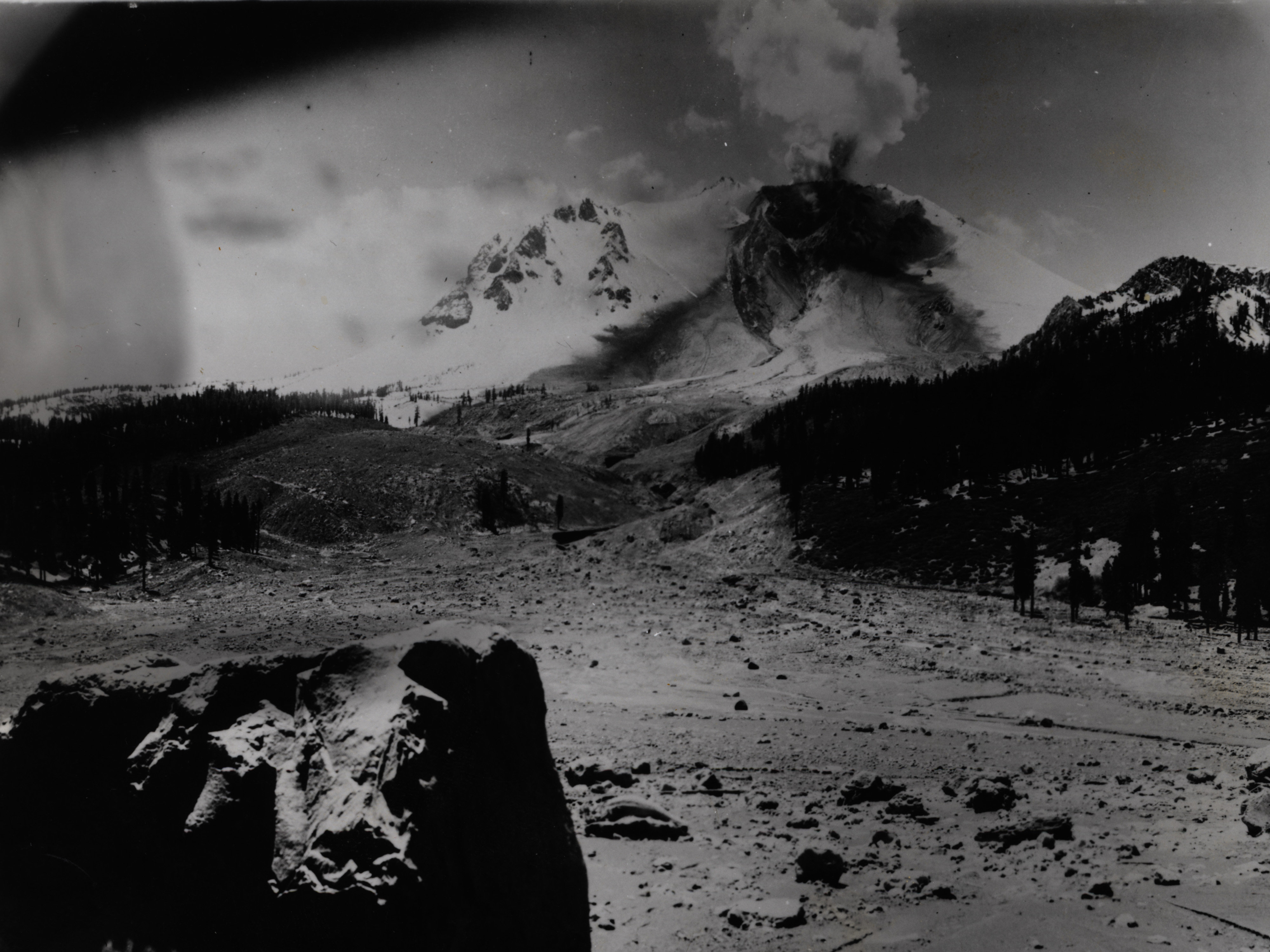 Benjamin F. Loomis Historical Photograph Collection:Steam issuing from summit of Lassen Peak from head of Lost Creek following mudflow. "Hot Rock"(large boulder) in foreground. Photographs taken a few hours prior to second major eruption and hot blast. 1.63 shows back of man_s head in lower right (large boulder) in foreground. Photographs taken a few hours prior to second major eruption and hot blast. 1.63 shows back of man_s head in lower right