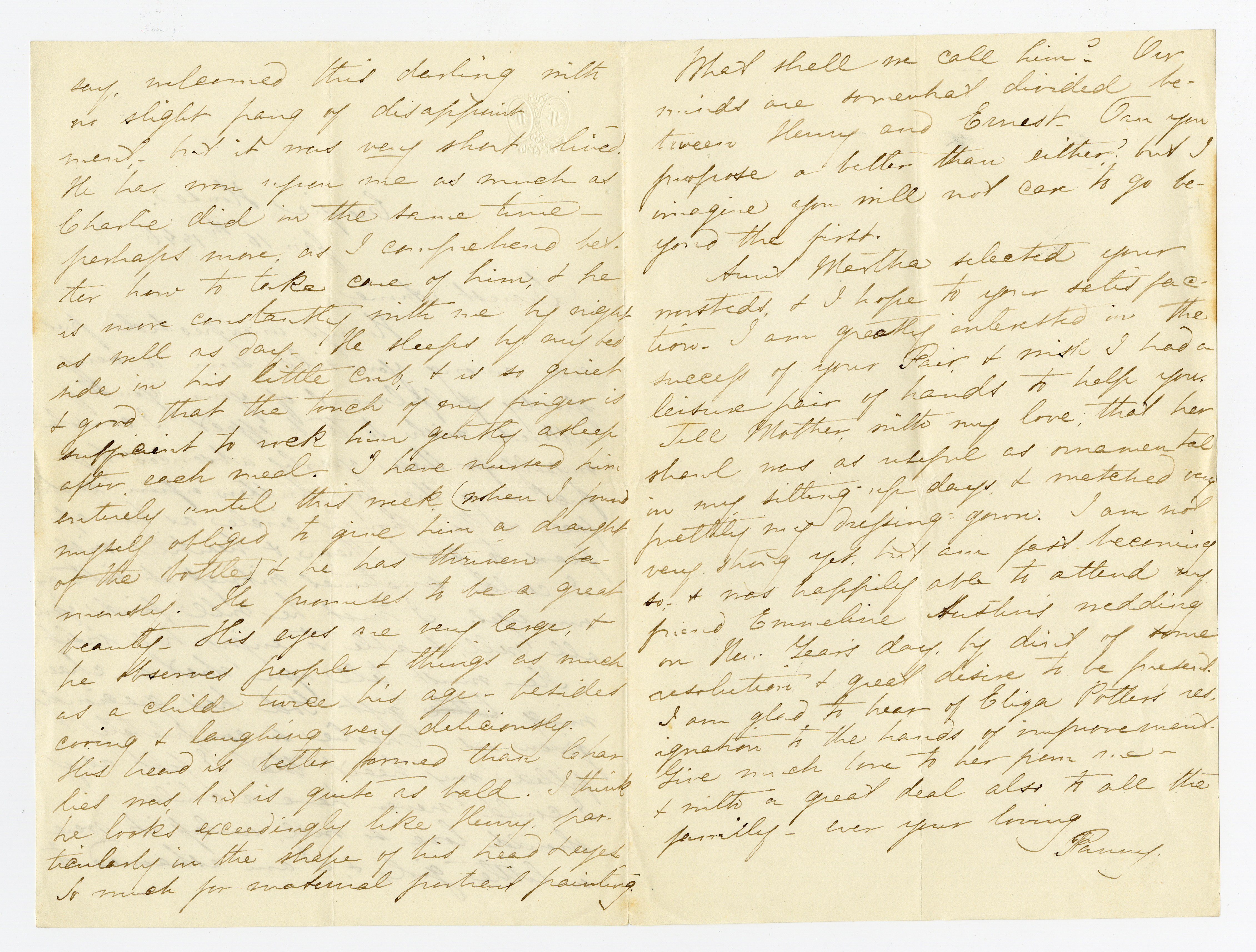 He must tell you what a charming [crossed out: little] gift God has graciously given us. Charlie so completely filled my heart that I felt as if I could never have a child I should love so well, unless it were a little girl, &, I am ashamed to [p. 2] say, welcomed this darling with no slight pang of disappointment, but it was very short lived. He has won upon me as much as Charlie did in the same time – perhaps more, as I comprehend better how to take care of him, & he is more constantly with me by night as well as day. He sleeps by my bedside in his little crib, & is so quiet & good that the touch of my finger is sufficient to rock him gently asleep after each meal. I have nursed him entirely until this week (when I found myself obliged to give him a draught of the bottle) & he has thriven famously. He promises to be a great beauty. His eyes are very large, & he observes people & things as much as a child twice his age – besides cooing & laughing very deliciously. His head is better formed than Charlies was, but is quite as bald. I think he looks exceedingly like Henry, particularly in the shape of his head & eyes. So much for maternal portrait painting.