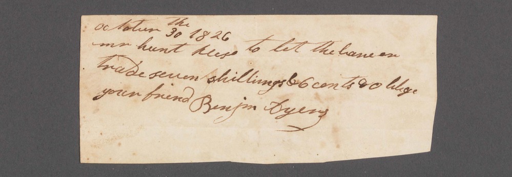 On front of document: "October the 30 1826 mr hunt please to let the barear trade seven shillings & 6 cents & oblige your friend Benjm Dyers" On back of document: "B. Dyers"