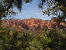 A vista of red sandstone canyons is framed by pine boughs.