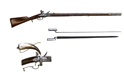The spot illustration replicates the officer’s rifle owned by Kings Mountain National Military Park which has the distinctive cross-hatching on the stock where it joins the lock. The rifle is shown with its ramrod in place and the breechloading mechanism closed.; a partial cutaway, close-up detail of the Ferguson rifle’s breechloading mechanism showing the screw plug open exposing the threads, a ball (round bullet) in the chamber, and a powder horn pouring black powder into the open chamber; and two bayonets (top bayonet is preferable to reproduce as it shows the long reach needed by the Ferguson rifle, although the bayonet depicted at the bottom is also for a Ferguson rifle, the angle makes it look more appropriate for a Brown Bess musket, however the musket bayonet would be shorter than illustrated here).
