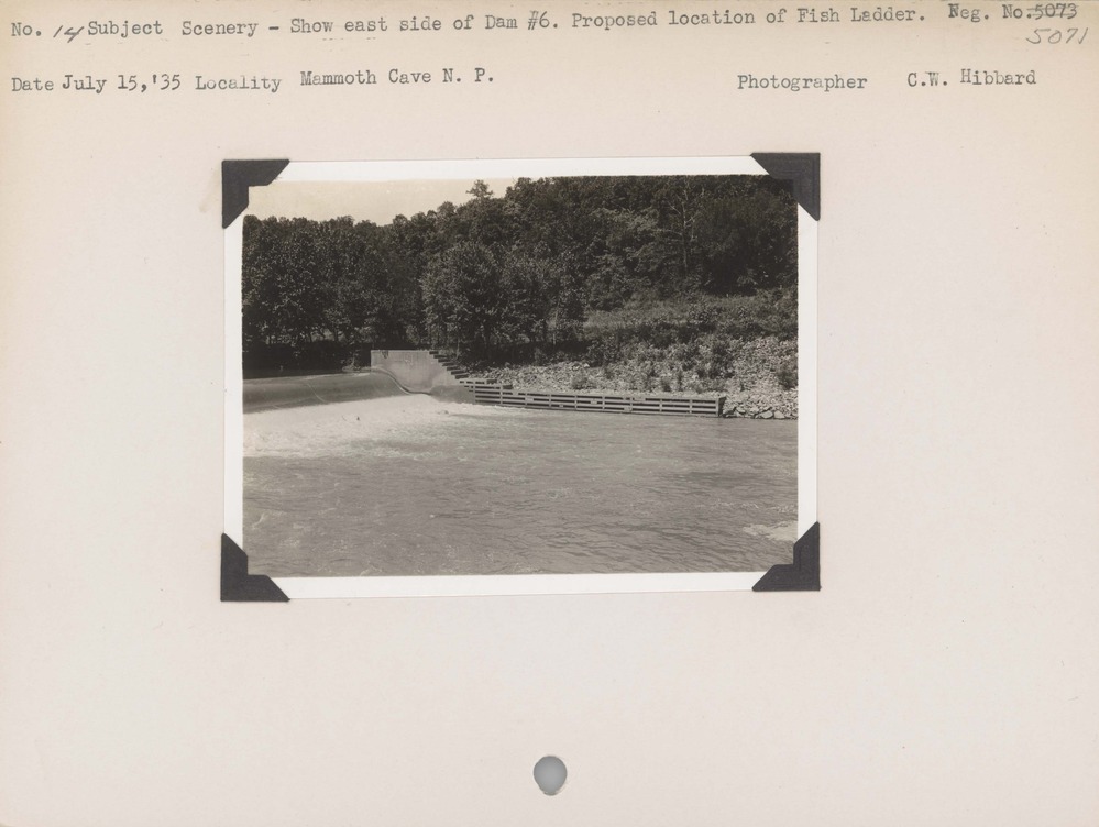 Scenery: Show east side of Dam number 6. Proposed location of fish ladder. Negative #: 5071. Locality: Mammoth Cave National Park.