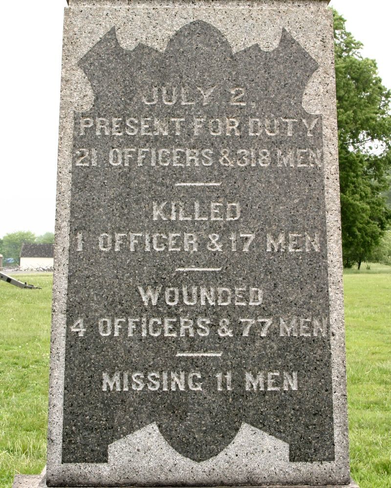 1 of 110 Monumnents to Pennsylvania. Indicates position held by 99th PA Infty July 3, 1863. Located E side Hancock Ave. || MN comprised of base, 3 part shaft, 2 part cap. Base 4'-2" sq. shaft of smooth & polished granite, alternating excised & incised lettering. Cap of cyma reversa, ogee, segmental arch, pryamidal cap. Chip in base, some stone staining.