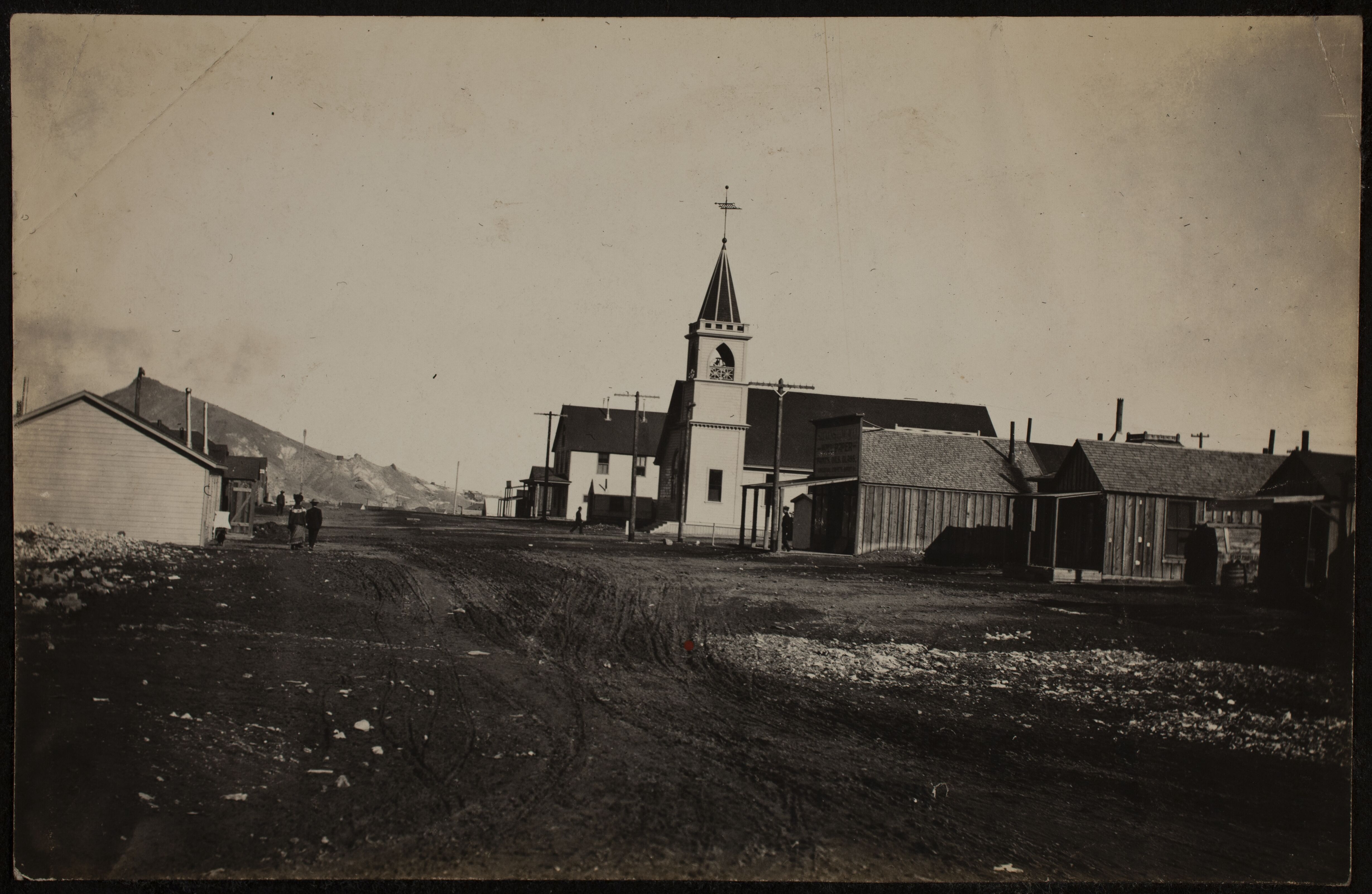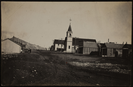 A church and town structures along a dirt road in an unidentified location. Davis Family Collection, Series II: Photographs, File 001 - Davis Family Album, Item 055.