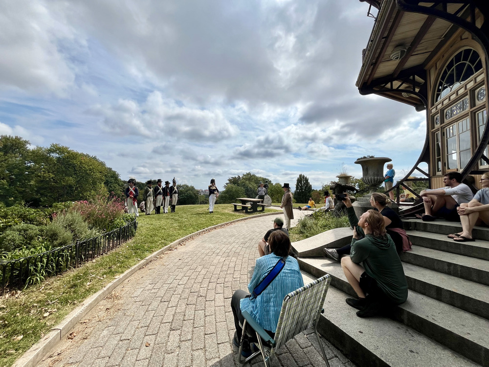 Visitors watch as living historians and rangers talk to them at Patterson Park