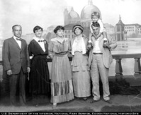 Miller Reese Hutchison (and family?) posing before painted backdrop of Venice. 10.138/14