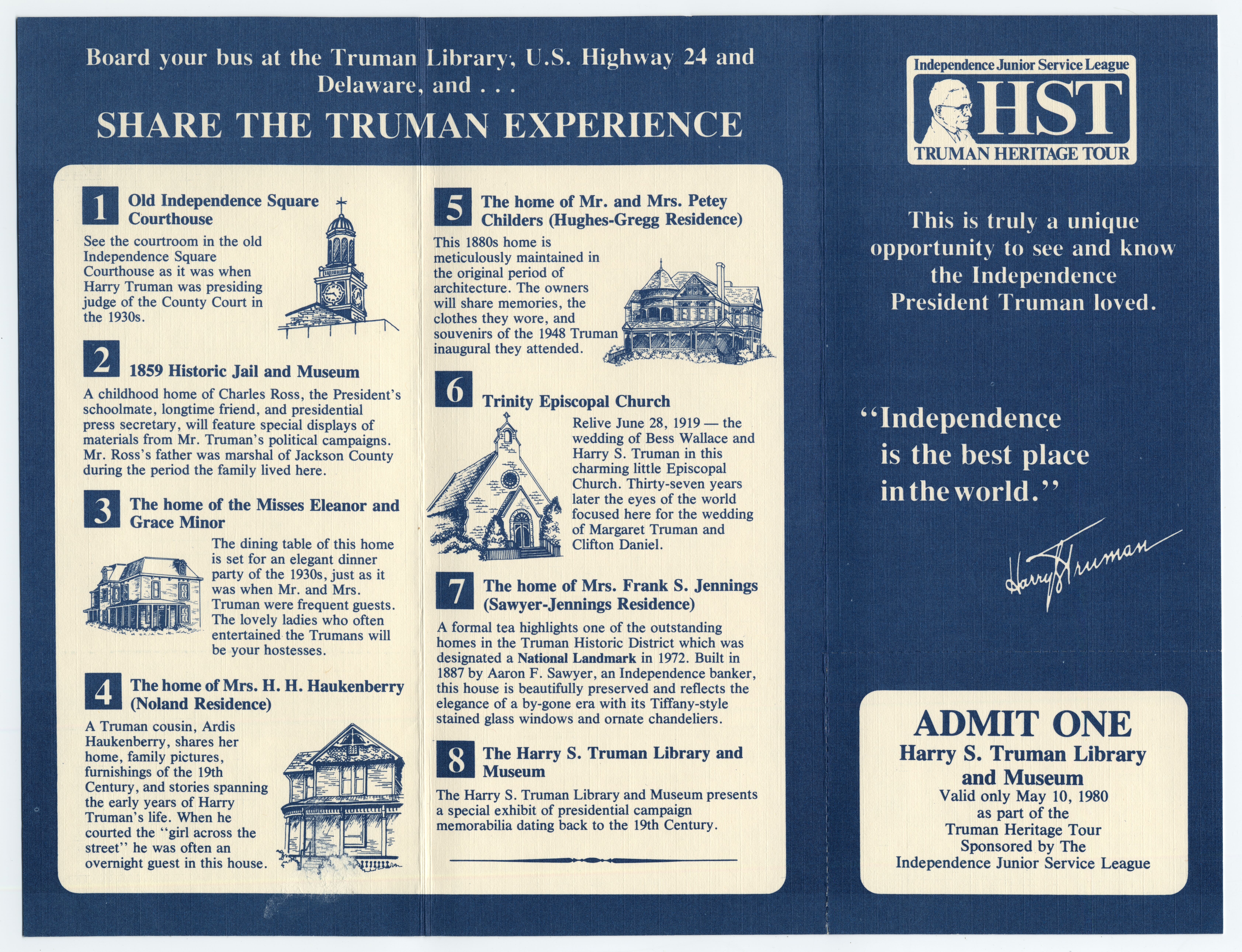 A brochure for the Truman Heritage Tour in Independence. The brochure also is used as a ticket for the tour. Starting at the Truman Library visitors board a bus and stop at 8 different sites. The brochure briefly talks about the sites and has advertisements for Independence businesses.