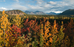 a forest turned gold, red and orange with fall colors, distant mountains under clouds