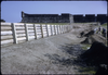 3 men with shovels moving dirt. Fort in Background. Replica town wall on the left.