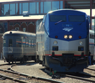 Former NYC 3 "Hickory Creek" parlor-observation car, with "20th Century Limited" tail marker, was on display adjacent to a modern passenger locomotive, Amtrak's P42 #75.