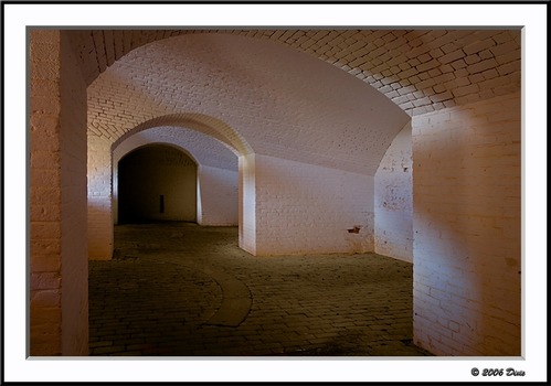 Afternoon sun shines through the embrasure openings on the white washed walls inside Fort Barrancas.