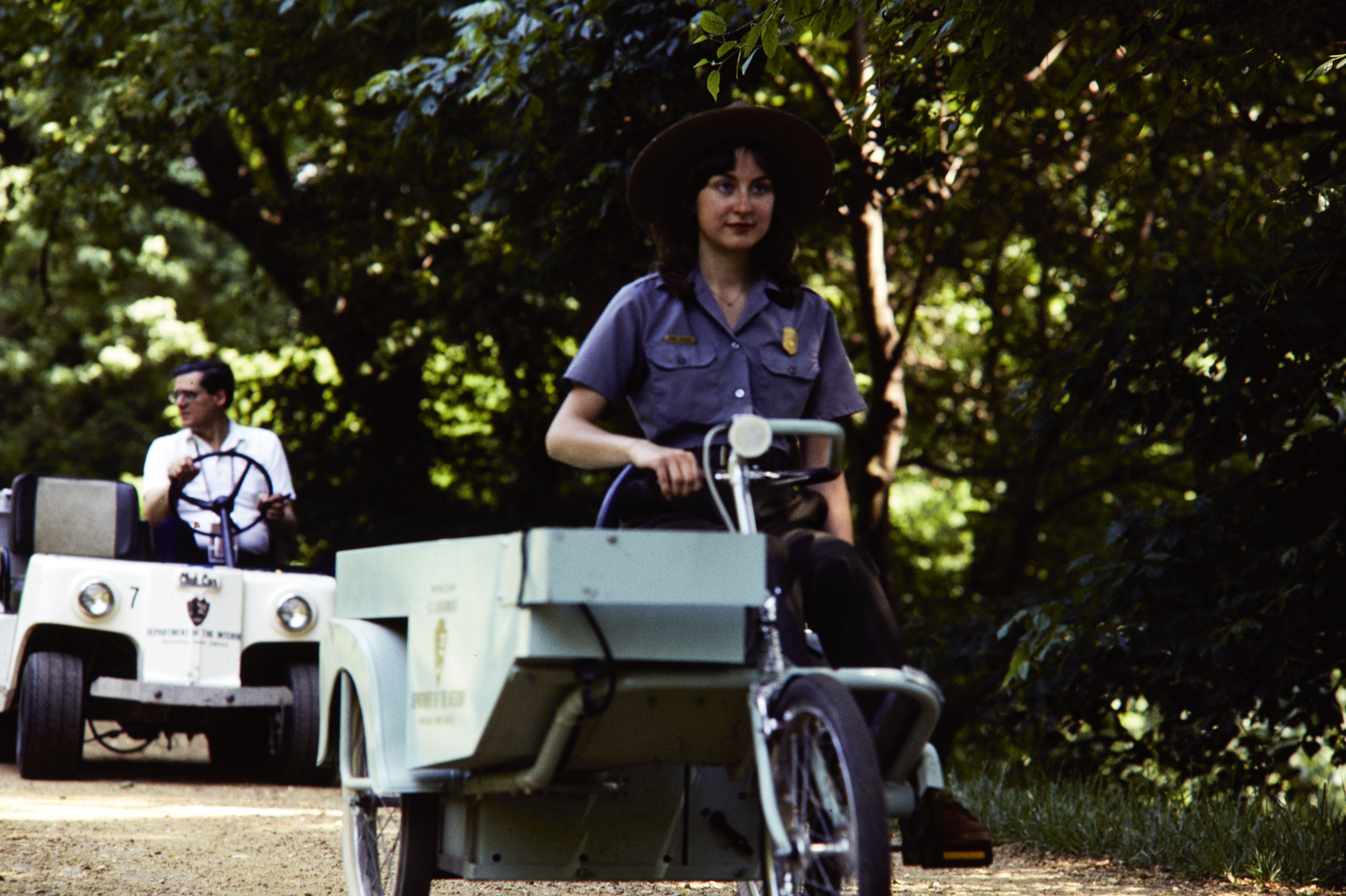 NPS employees, Anne Brooks, driving an energy saving machine in Chesapeake and Ohio Canal National Historical Park with Tom Hoke behind her.