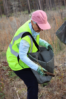 A volunteer wearing a pink hat and bright yellow-green vest holding a grass seedling