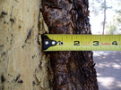 A close-up image of the outer- and inner-bark of a ponderosa pine tree with a ruler measuring a thickness of three inches for the outer bark
