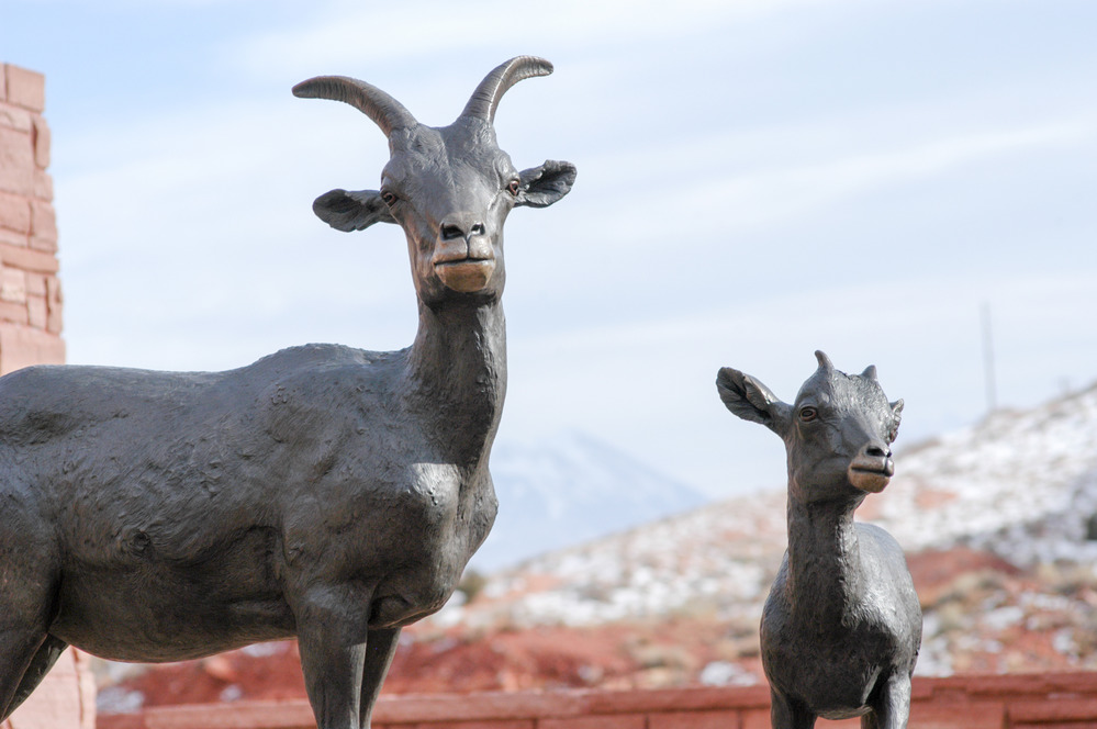a bronze sculpture of a bighorn sheep ewe and lamb