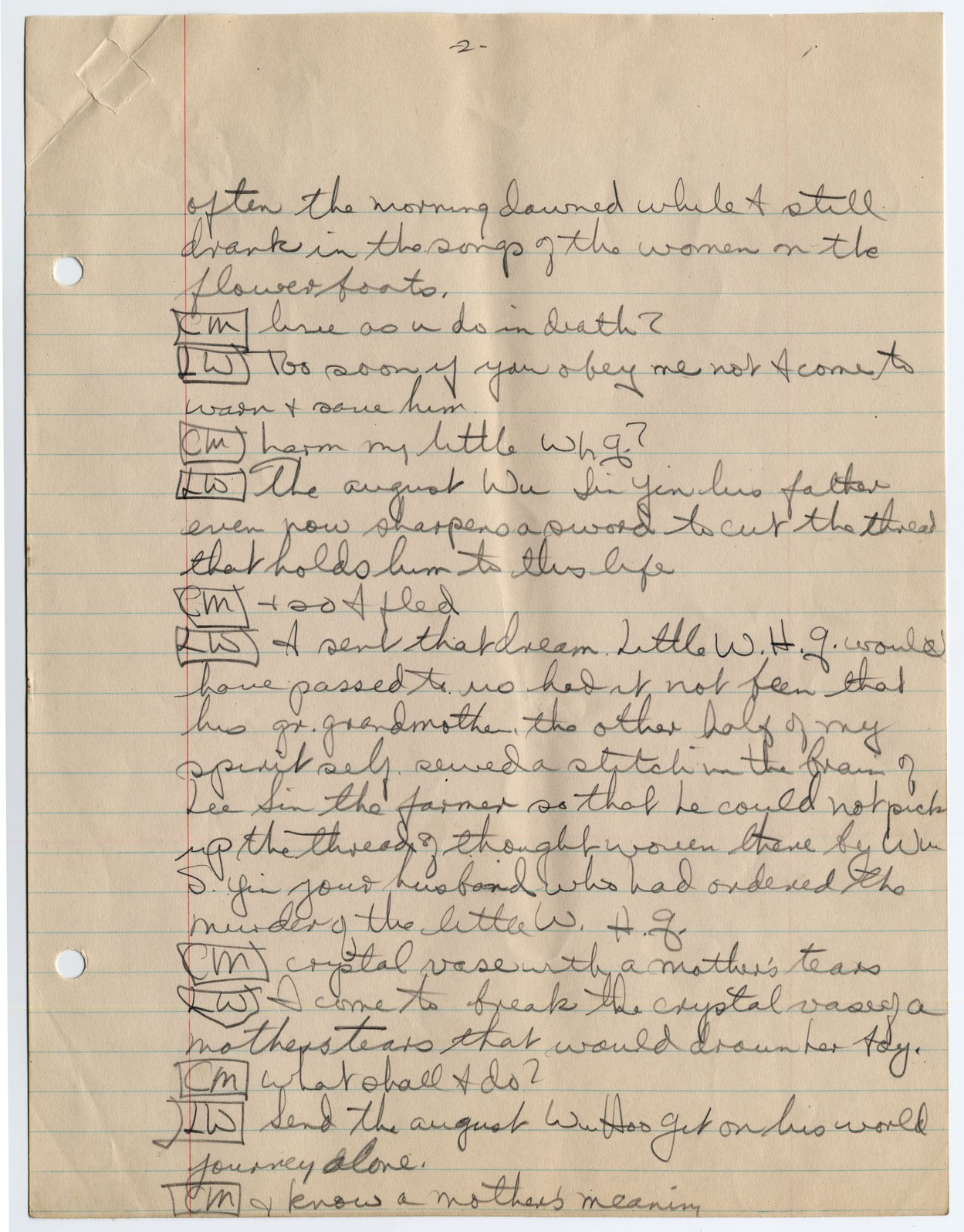 Second page of a play written down by Margaret Truman. The play is untitled and written on lined notebook paper.