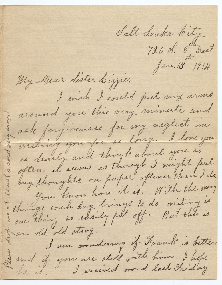 A letter written from Jennie A. Emery to her sister, Elizabeth Emery Gates. The letter was sent from Salt Lake City, Utah to Independence, Missouri on January 13, 1914. The letter mentions the death of a brother.