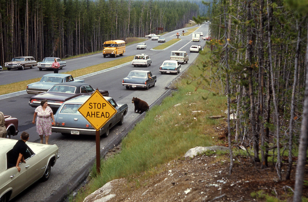 One black bear sitting on side of road near a 4 way junction with cars stopped and people standing nearby