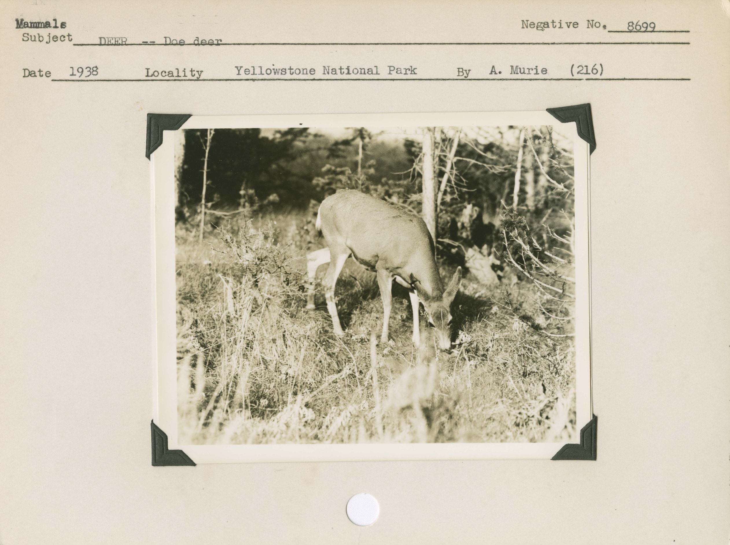 Mule Deer – Doe. Locality: Antelope Creek, Yellowstone National Park. Negative: 8699. Location of Negative: San Francisco. [Some of this information comes from the reverse of the envelope for this negative number. Card specifies 1938 as date, while envelope specifies September 28, 1937].