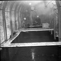 Workers on temporary platforms above the fresh concrete tunnel floor