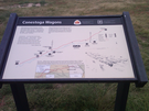 A wayside titled "Conestoga Wagons" with some text and illustration on it in a grassy field.