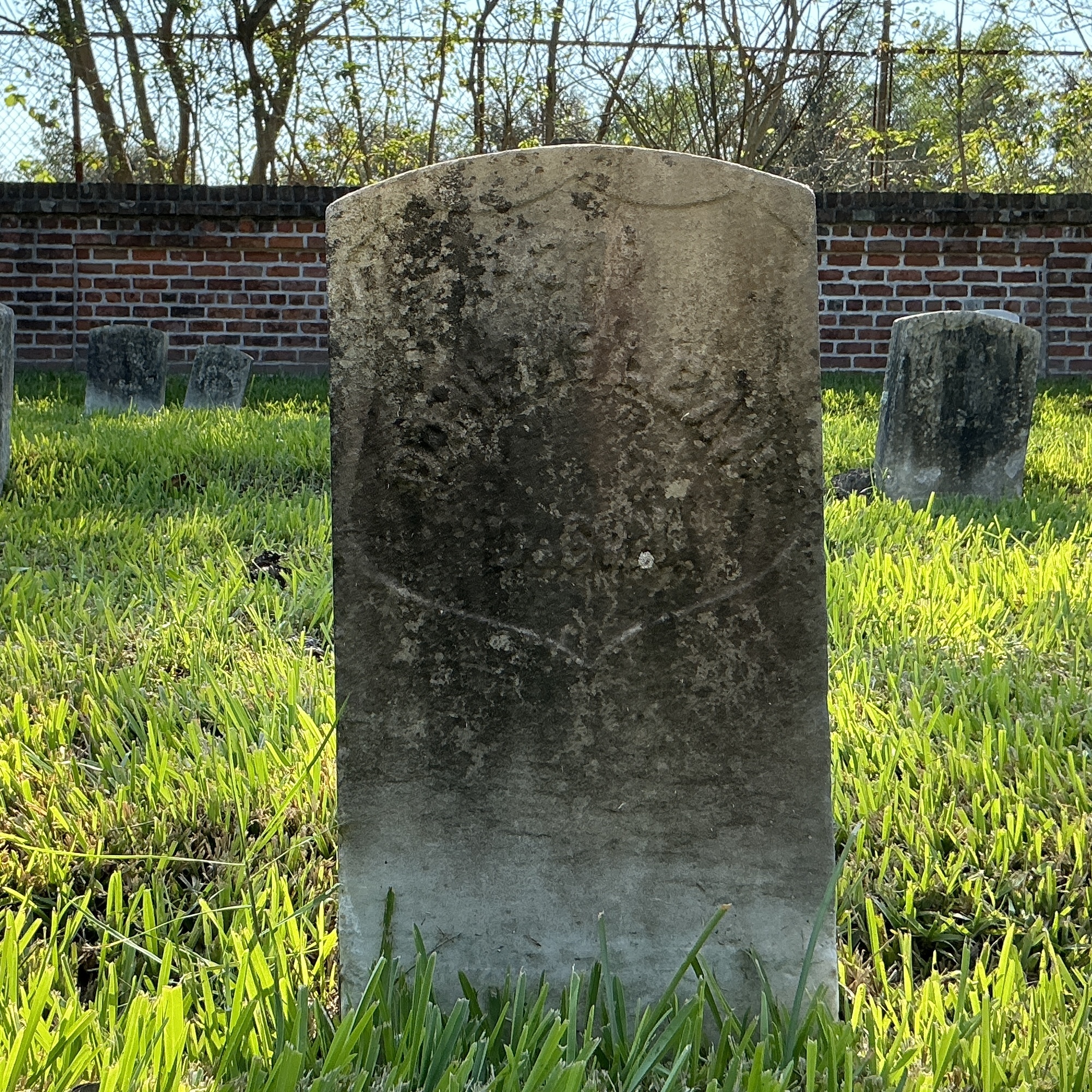 Front of historic upright marble headstone with recessed shield face.