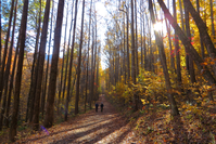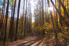 Two people walk along a unpaved road in the woods; full fall color