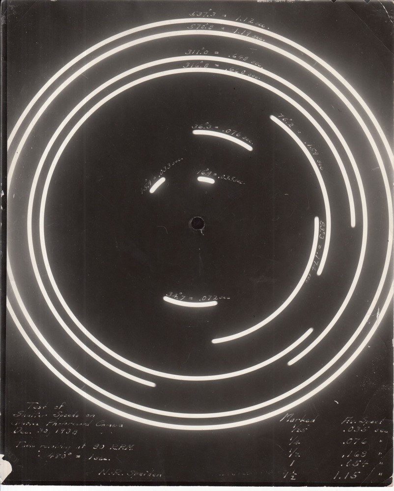 "Test of shutter speeds as recorded by a Graflex photorecord camera. N.R. Speiden" (Norman Speiden)