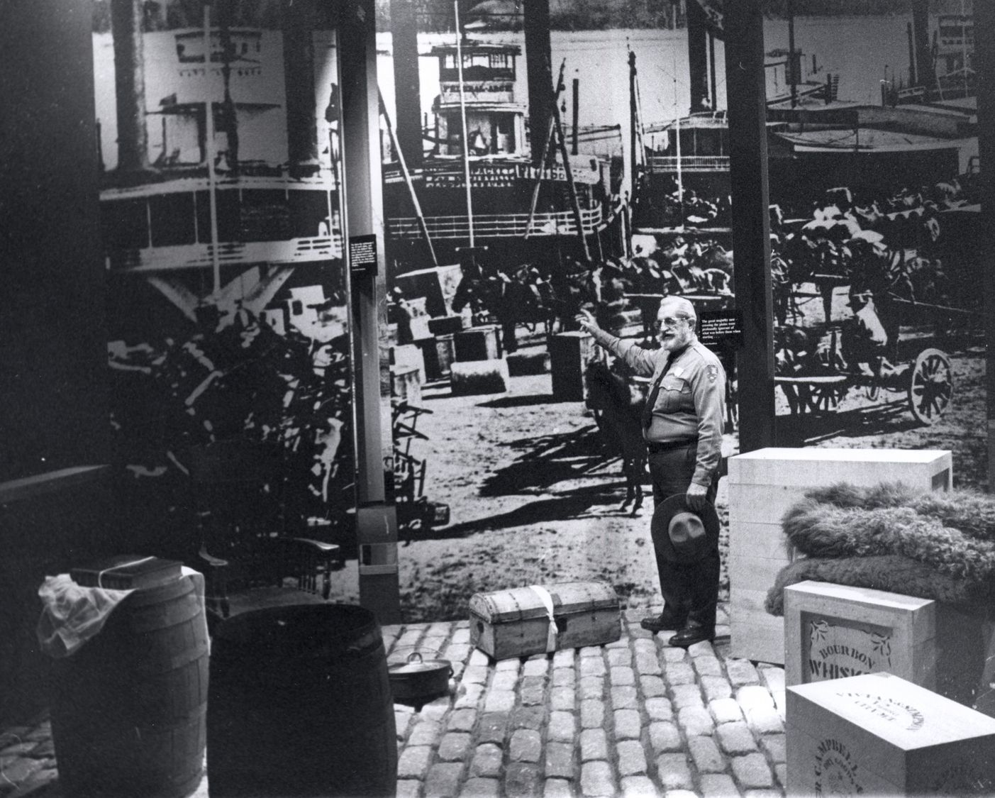 MWE-Programs-Interpreter giving a program in front of the Riverfront diorama. ; 1930s-1990s