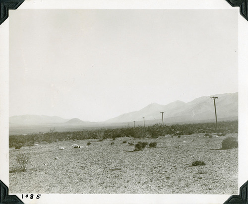 Owns Valley near Little Lake. Telephone or telegraph poles leading into the distance. Circa 1922. Location based on DEVA 42695. Number in black ink lower left corner refers to historic photograph numbering system: 1085. Listed in earlier catalog record Other Numbers Field: 9. Black and white, 4 x 5 inch, horizontal format. Corner mounted on photograph album page.