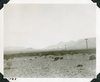 This is an historic black and white photograph from the Scotty's Castle Historic Photograph Collection, Death Valley National Park of desert landscape with sparce vegetation. Mountains in distance. Utility poles running off to left. Number in black ink in lower left corner.