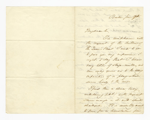 Reactions to play, The Queen’s Heart [written by John Williamson Palmer], likely addressed to Mr. Barrow, a manager of the Howard Athenaeum in Boston.
