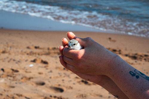 A person gently holds a small plover chick, with a beach and lake waves in the background.
