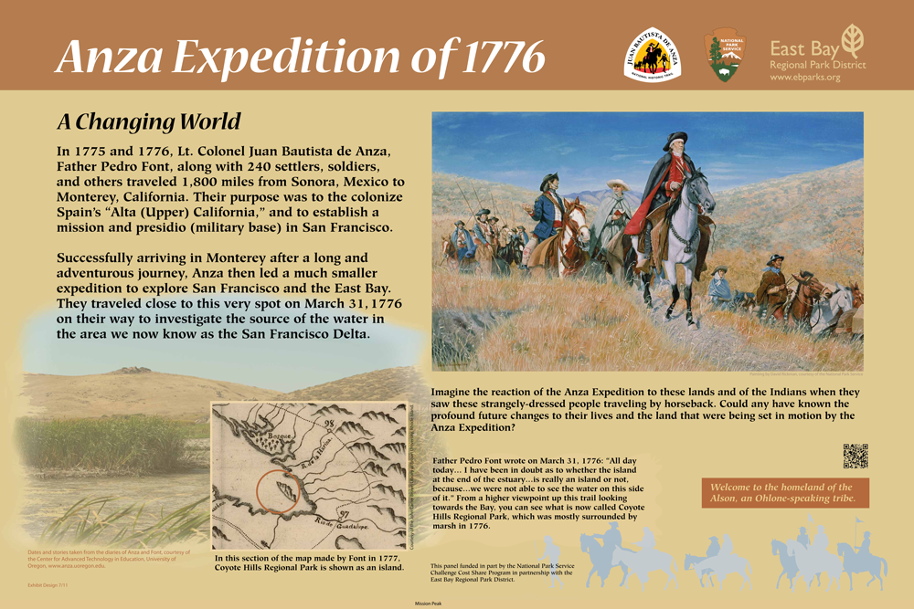 An interpretive panel titled Anza Expedition of 1776 A Changing World with illustrations of the expedition and a map with narrative text in English