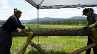 TTAP intern Arua and NPS staff Elizabeth LaRochelle are using draw knives to shave the bark off the log.