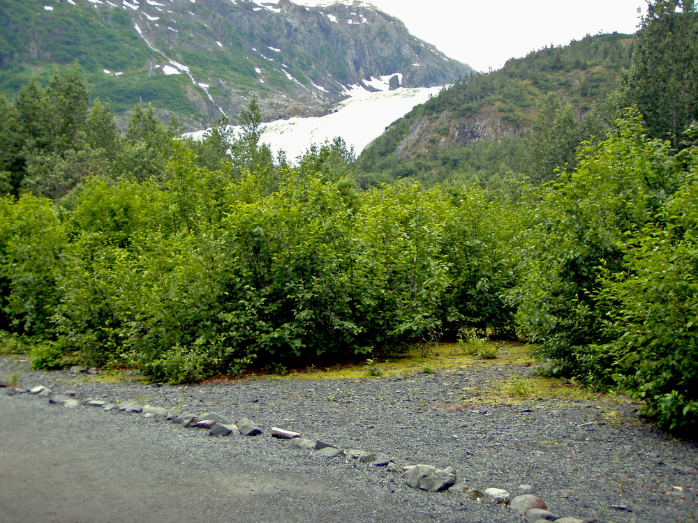 Exit Glacier viewed from a point on the main trail just beyond the stone shelter kiosk on July 28, 2010