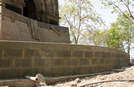 A cinderblock retaining wall with a concrete sidewalk stands elevated along a large stone monument, drainage pipes and rocks are at the base of the wall.