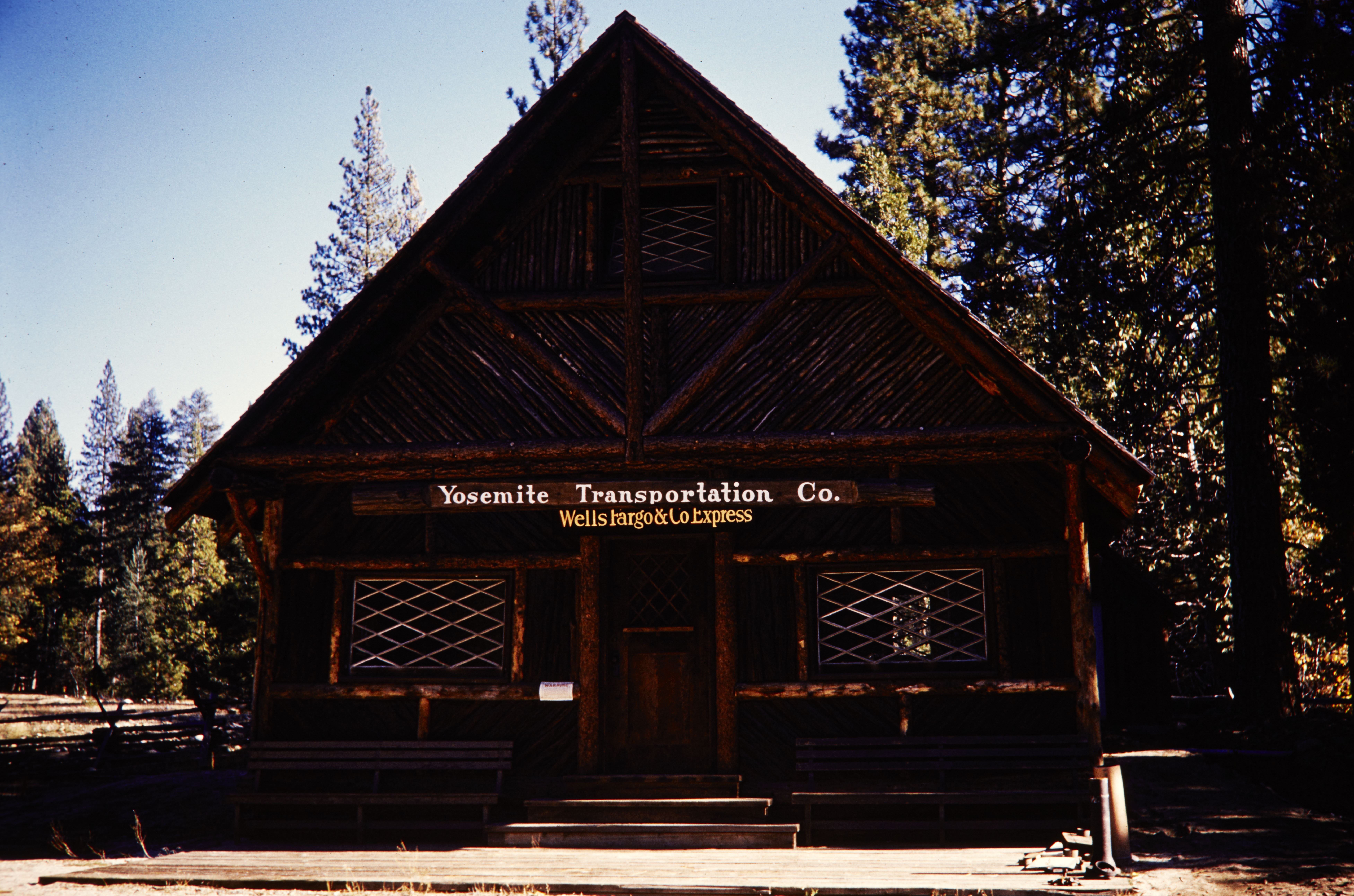 Wells Fargo building with the sign Yosemite Tansportation Co. on the building as well in Yosemite National Park.