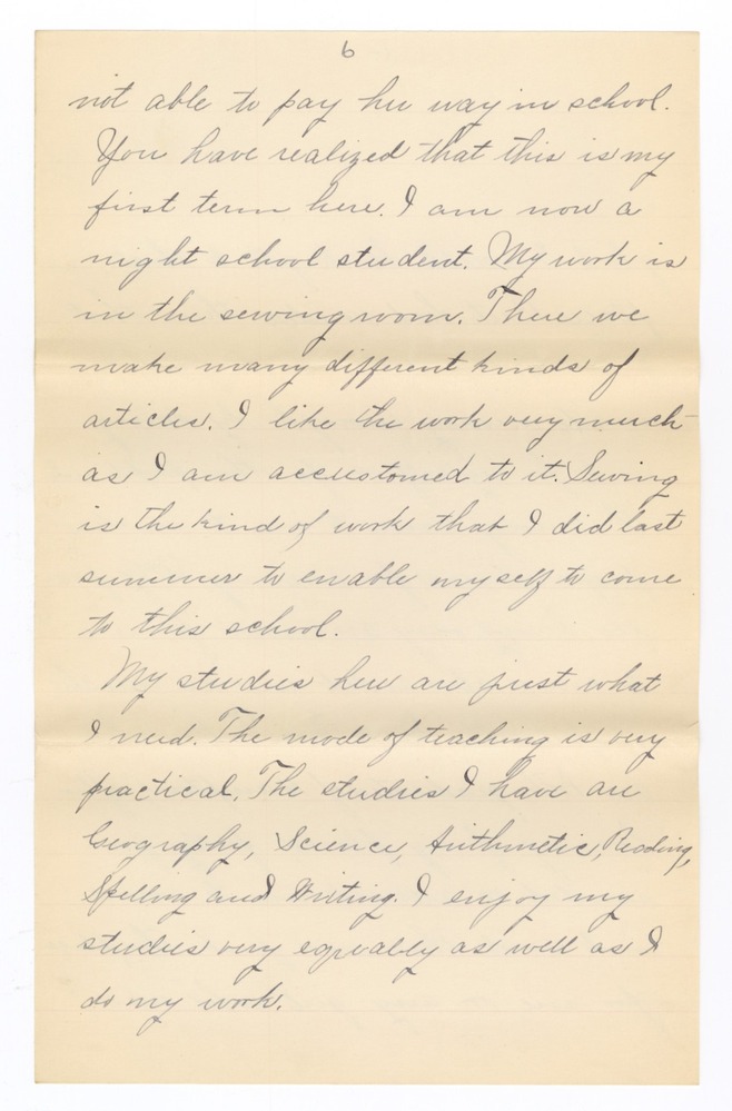 My studies here are just what I need. The mode of teaching is very practical. The studies I have are Geography, Science, Arithmetic, Reading, Spelling and Writing. I enjoy my studies very equally as well as I do my work. [p. 7] Now I have reached the school that I have so long wanted to attend. I have the promise of a generous lady’s scholarship fee, and many kind teachers. I will do the very best I can so that none of these goods [sic] things will be for nothing.