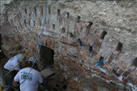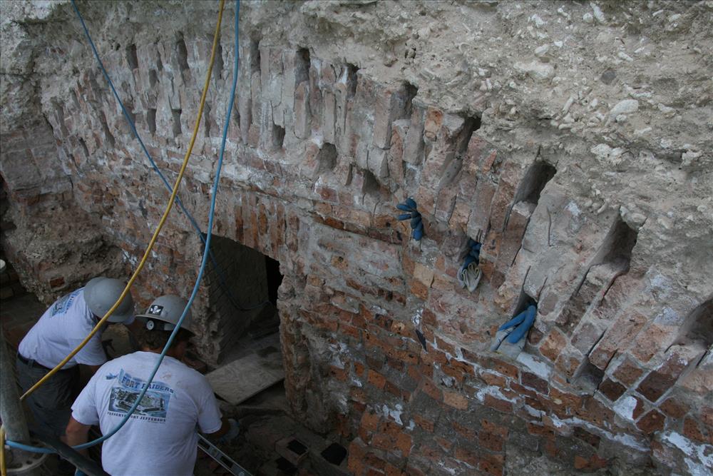 Image of scarp wall of Fort Jefferson before, during, and after treatment of Phase 2 of Stabilize Fort Jefferson. Partially funded by ARRA.