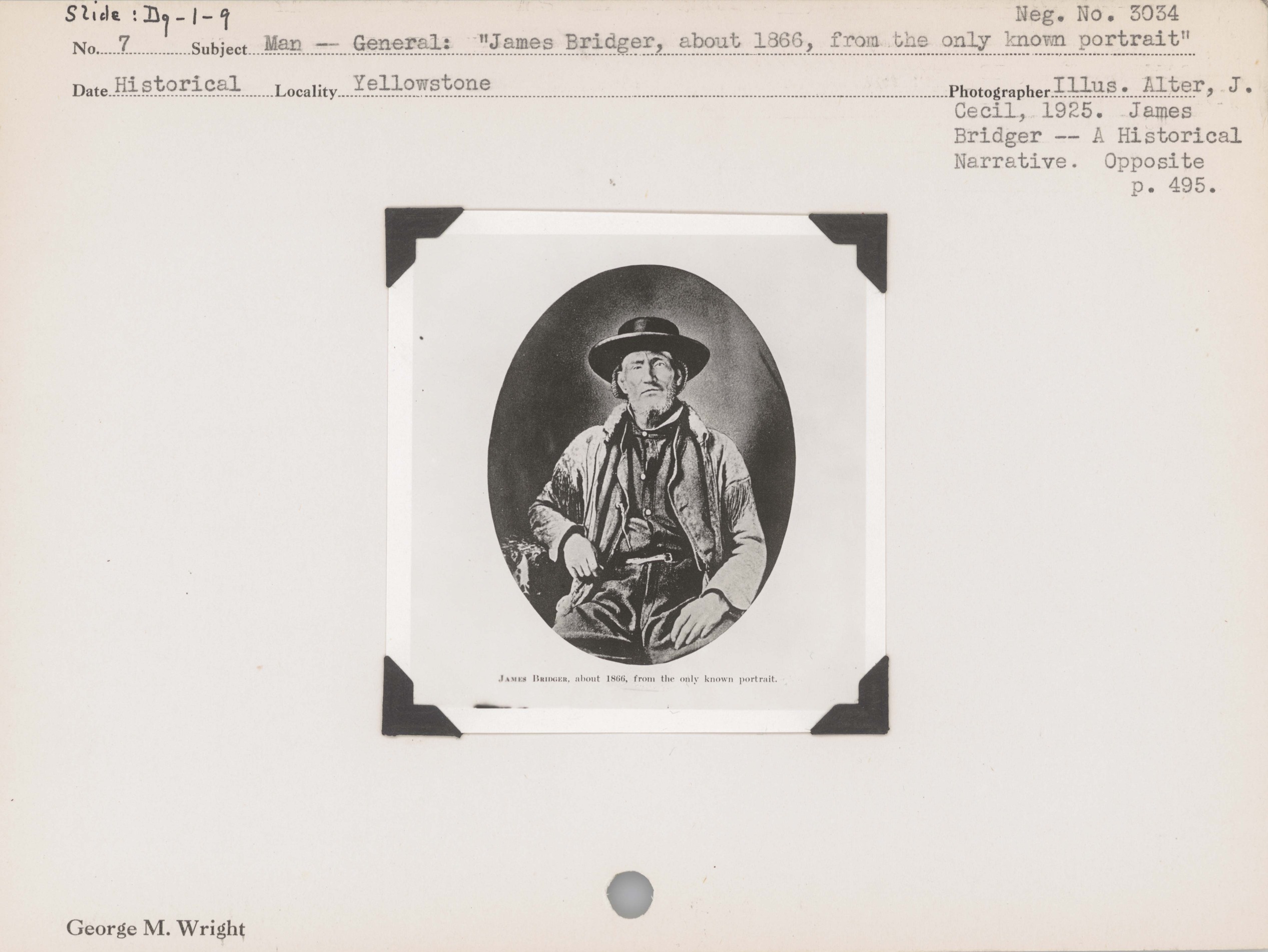 Man--General--"James Bridger, about 1866, from the only known portrait.". Locality: Yellowstone National Park . Negative #: 3034. Historical. Illustrator Alter, J. Cecil, 1925. James Bridger--A Historical Narrative. Opposite p. 495.