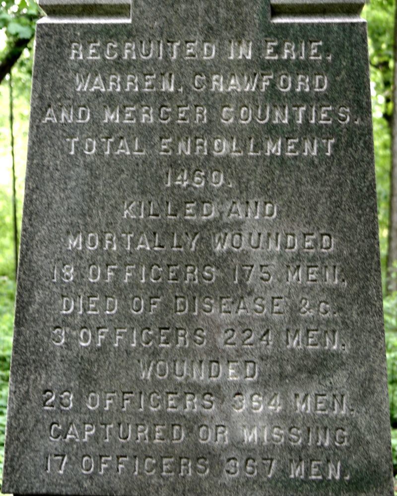 1 of 110 mns in Park to Pennsylvania commands in Gettysburg Campaign. Marks position of 145 PA when driving Confederates of Kershaw's Brigade from edge of Wheatfield to point beyond this position. Located on NE side of Brooke Ave in Rose Woods. || MN & 2 Flank Markers. Hammered base, 6'5" sq. Shaft, 3'4"x2'4", topped w/ statue of infantryman w/ musket. All 10'9" high. Inscriptions incised on shaft & State coat of arms on S. Flank markers, 1'x1'x1'6", flat-topped w/ inscription on face.