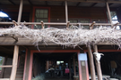 A view looking up towards the second story veranda reveals hay and cattle skull adornments.