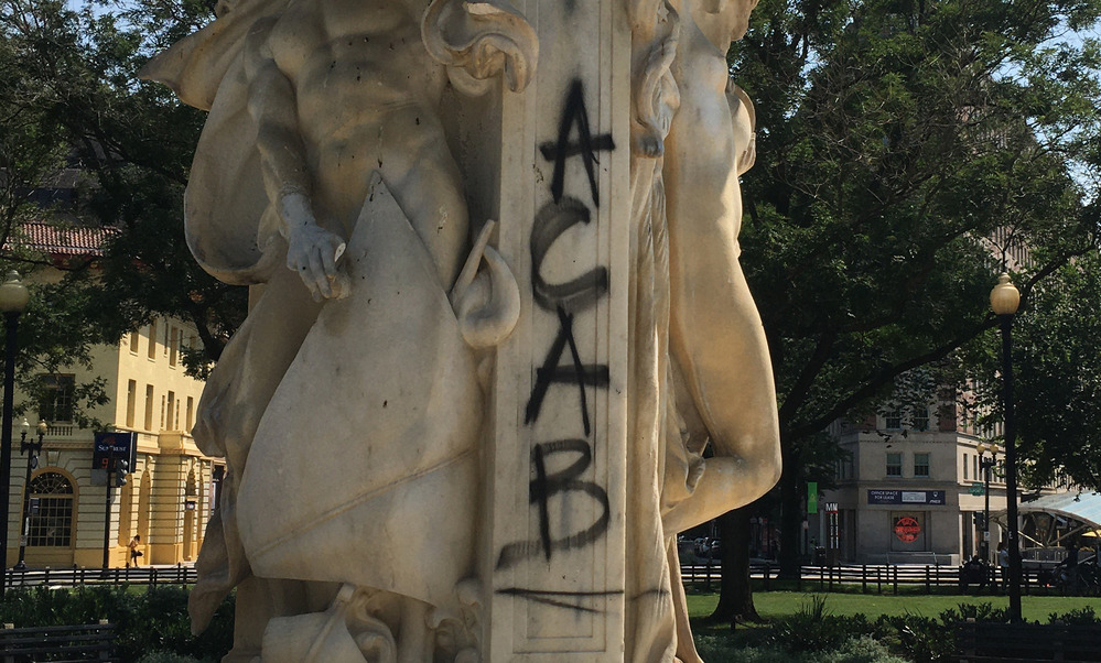 A close-up view of the entire graffiti message "ACAB" spray painted on the Dupont Circle Fountain.