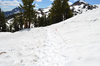 An orange-flagged wand rests in the snow to the right of the snow-covered Lassen Peak Trail. Brokeoff Mountain and Eagle Peak in the background.
