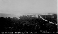 Black and white photograph showing a landscape covered in trees. Near the horizon, steam is emitting from the ground and rising up towards the sky. Handwriting on the photo reads “steaming earthquake cracks Hawaii National Park.”