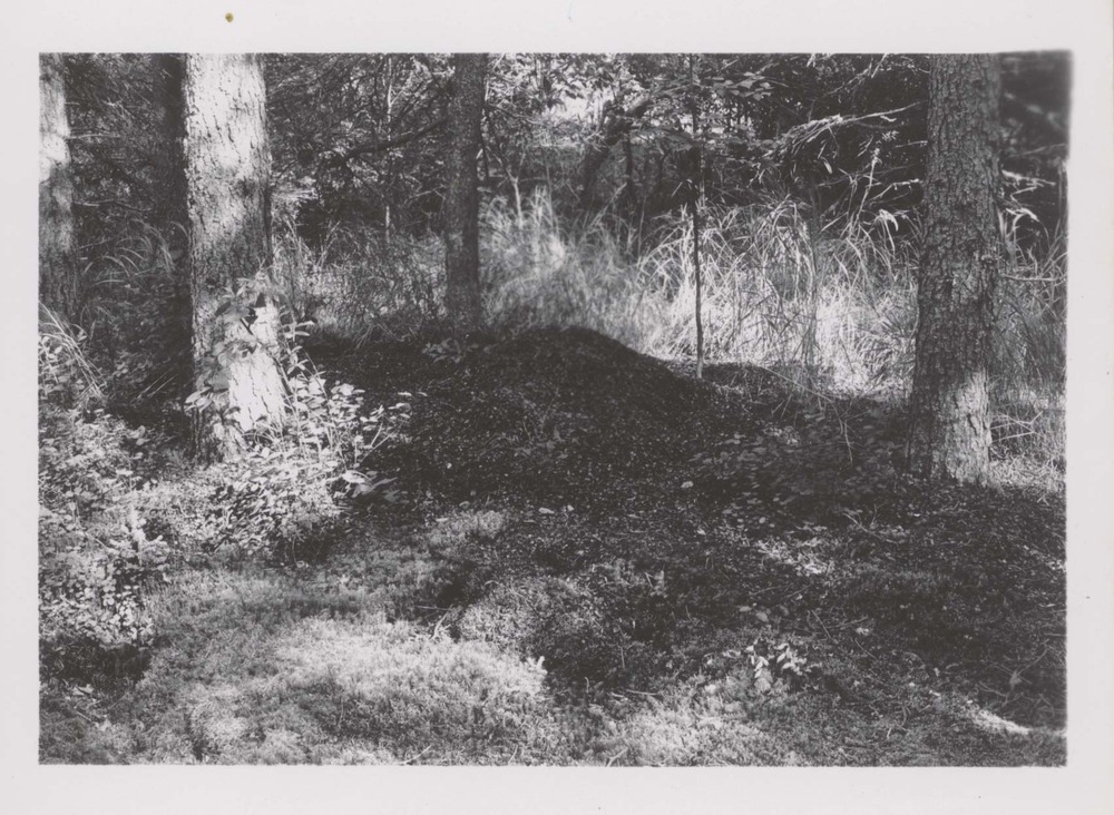 Midden of spruce-cone bracts utilized by red squirrel. In spruce forest east of Brooks River. Negative #: 12065. Locality: Katmai National Monument. [This information comes from the reverse of the envelope for this negative number.].