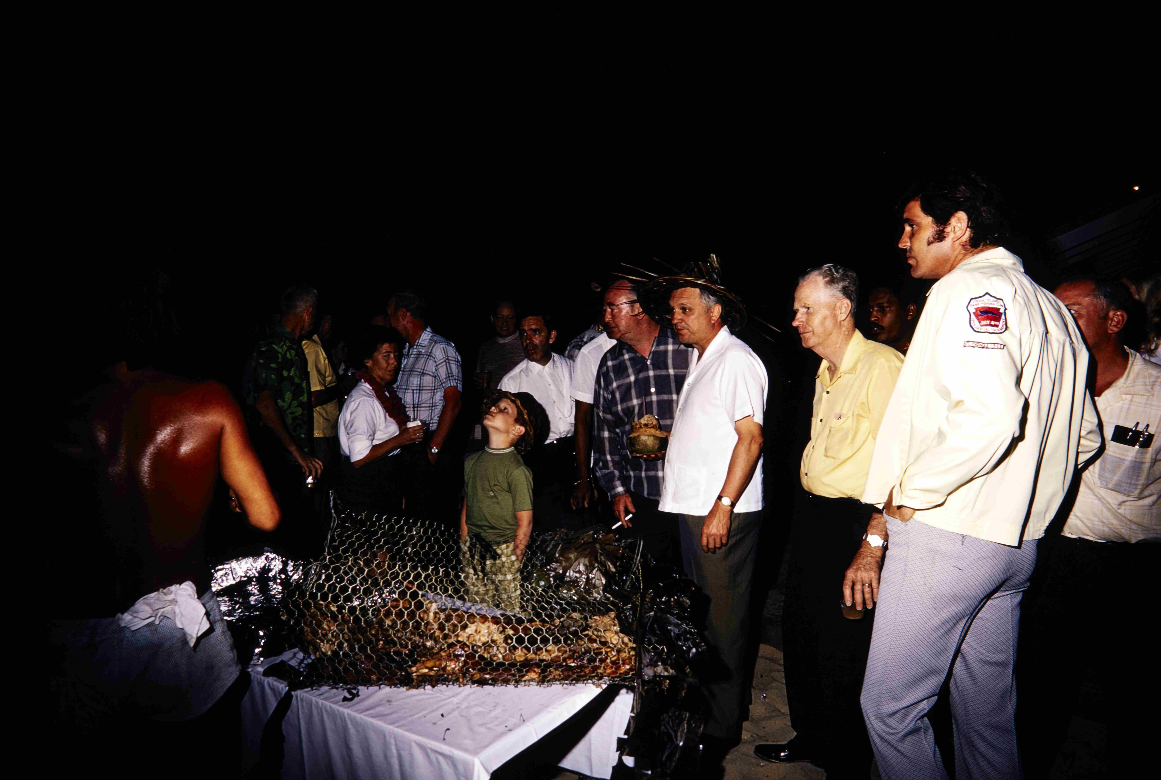 People standing around a buffet during the Tektite II Project in Virgin Islands National Park.