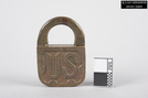 color photo of half of medium-sized, rectangular brass padlock reading, "US" on the front