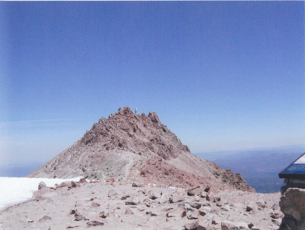View of the summit of Lassen Peak with patches of snow and a wayside to the right.